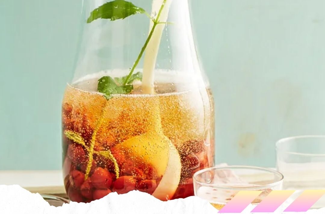 3. Die Bowle mit Zitronen- und Orangenscheiben sowie Eiswürfeln servieren.
