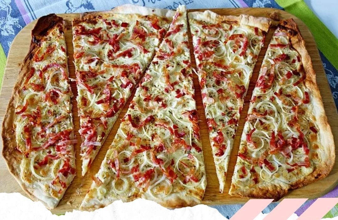 6. Flammkuchen im vorgeheizten Ofen etwa 15-20 Minuten backen, bis der Rand goldbraun ist.