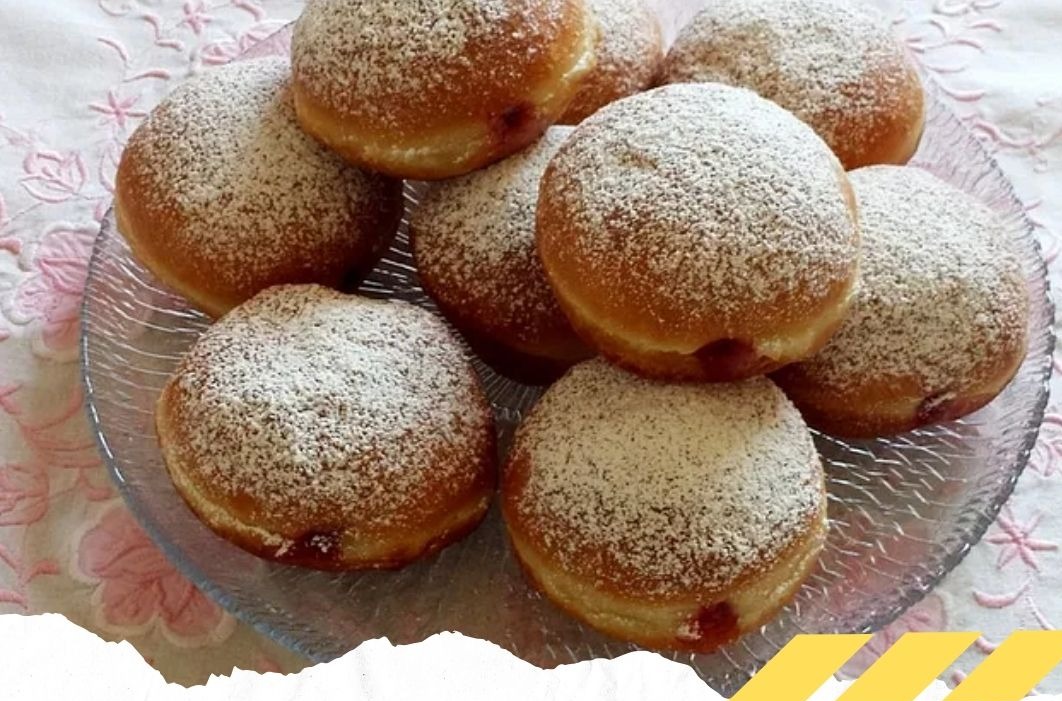 5- Auf Küchenpapier abtropfen lassen, dann mit einem Spritzbeutel und langer Tülle die Konfitüre in die Berliner füllen und im restlichen Zucker wälzen.