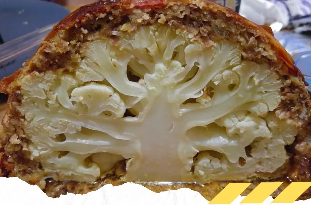 Backblech mit Alufolie und Backpapier belegen. Den Blumenkohl mit Strunk nach unten in die Mitte setzen. Kartoffelspalten außen herum verteilen. Die Hackfleisch-Haube auf den Blumenkohl setzen und mit Bacon umwickeln.