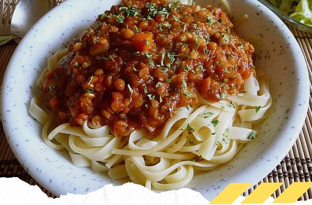In einer hohen Pfanne die Zwiebel, den Knoblauch, die Karotten und den Sellerie bei mittlerer Temperatur anschwitzen. Das Tomatenmark hinzugeben und anrösten. Die Tomaten, die Brühe, die Linsen und die Kräuter, außer der Petersilie, hinzufügen. Mit einem Deckel bedecken und ca. 20–25 Minuten leise köcheln lassen. Falls nötig, noch etwas Flüssigkeit dazugeben. Die Bolognese sollte die Konsistenz einer normalen Hackfleischsauce haben.