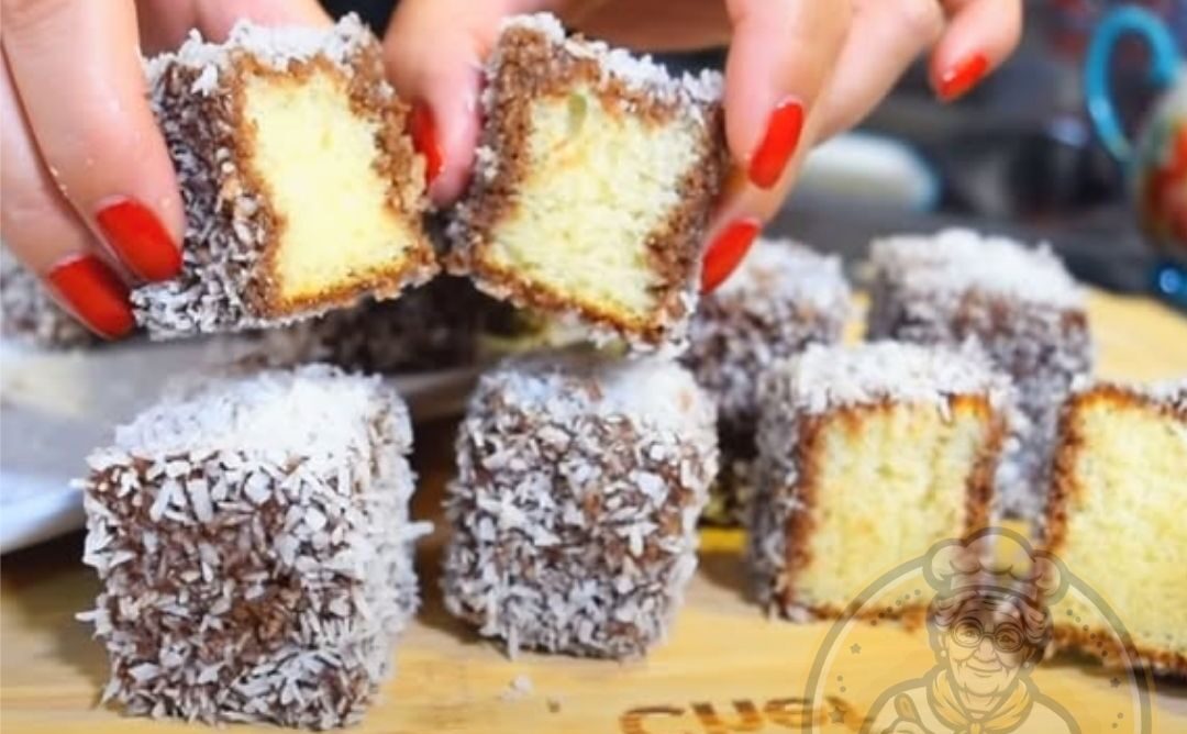 6. Für den Guss: Puderzucker, Kakaopulver, Butter, Vanillezucker und kochendes Wasser gut vermischen. Die Kuchenwürfel in der Schokosauce von allen Seiten wenden und anschließend in den Kokosraspeln wälzen.