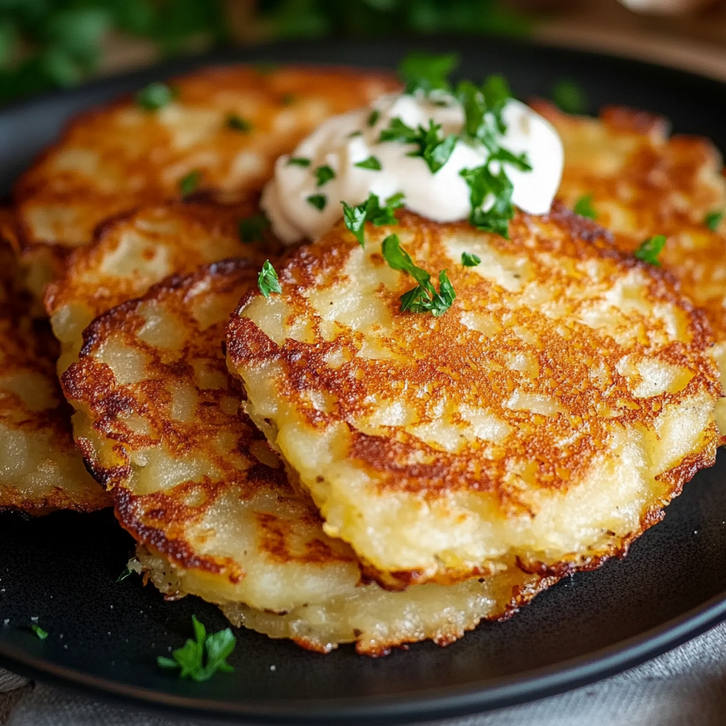 Deutsche Kartoffelpuffer sind ein traditionelles Gericht aus geriebenen Kartoffeln, Eiern, Mehl, Zwiebeln und Gewürzen, die in Öl goldbraun gebraten werden.