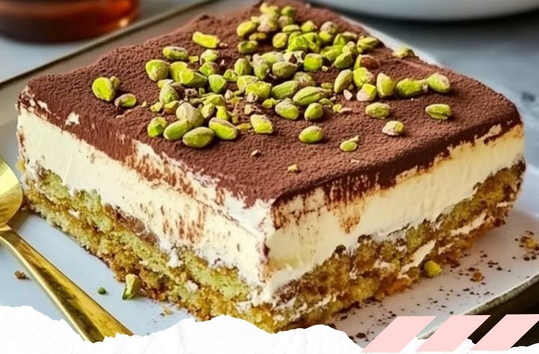 5. Kuvertüre mit Schlagsahne schmelzen und über das Tiramisu geben. Mit gehackten Pistazien bestreuen und 4 Stunden kaltstellen.