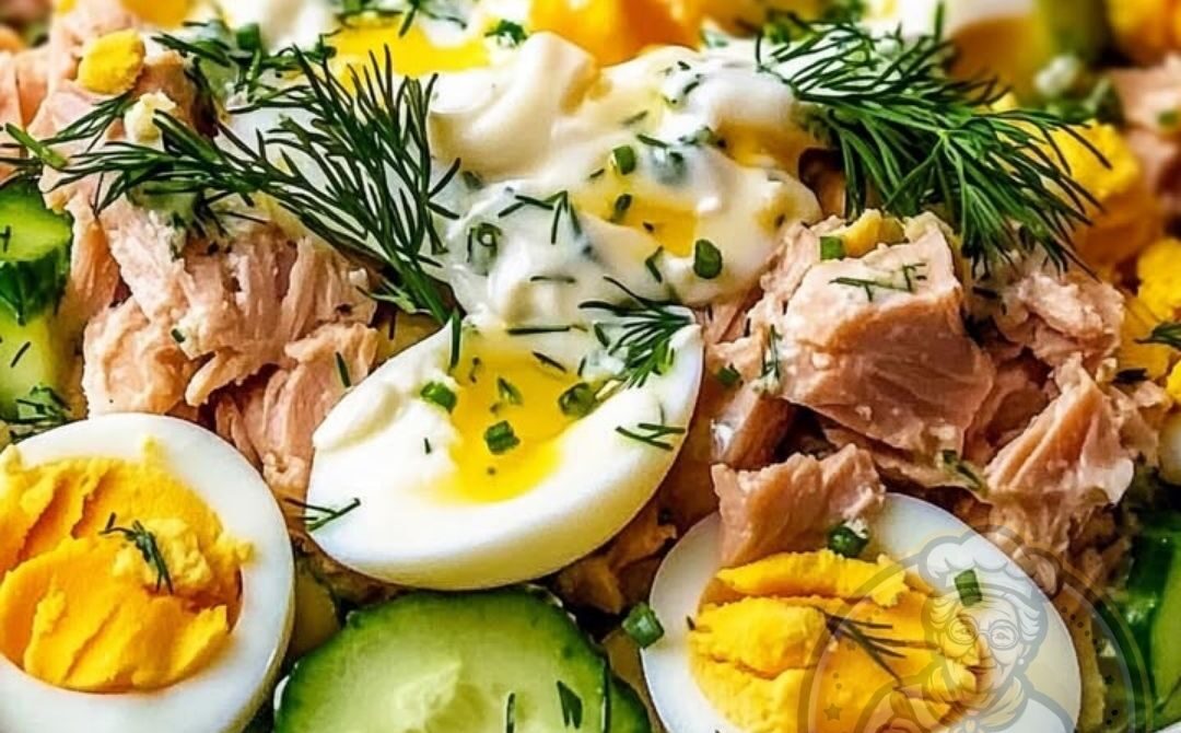 5- Das Dressing vorsichtig unter die Thunfisch-Ei-Gurken-Mischung heben.