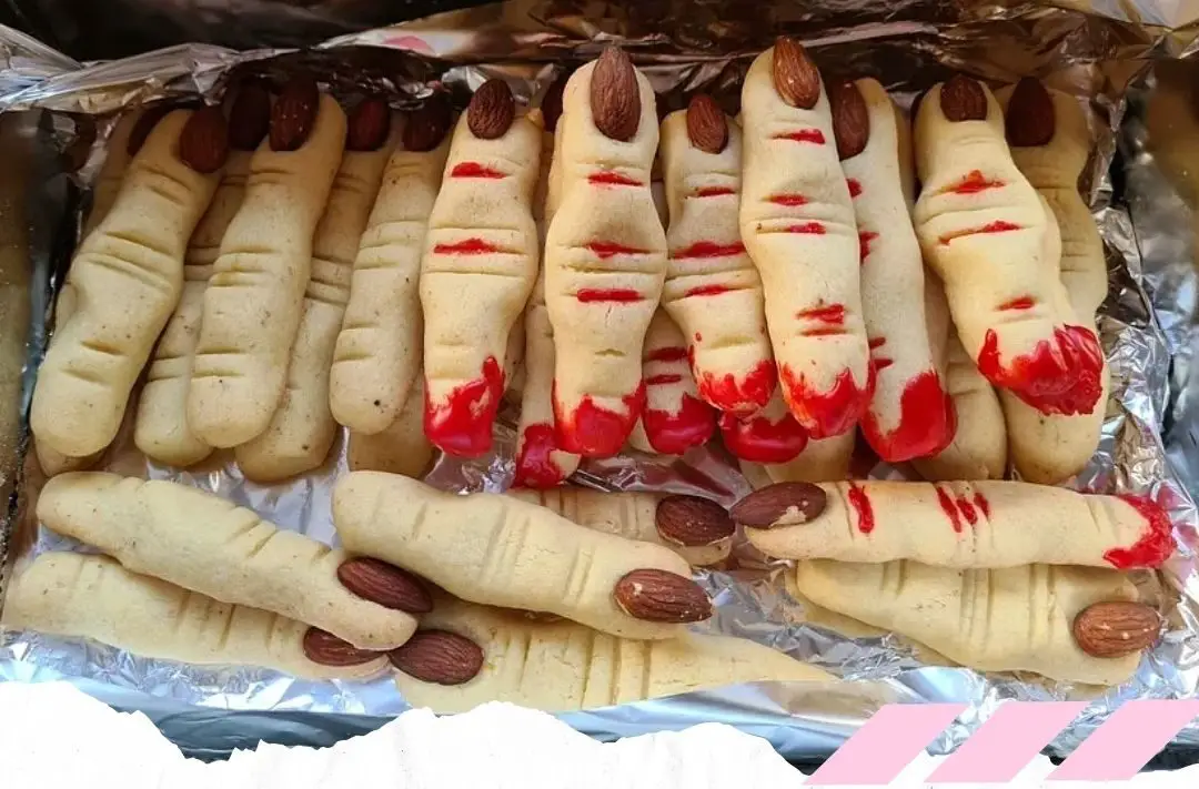 Um den Effekt perfekt zu machen, sollten die Teigstücke sorgfältig in fingerähnliche Formen gerollt werden. Mit einer Mandel als Fingernagel und etwas Lebensmittelfarbe für das Blutige sehen die Fiesen Finger besonders realistisch aus.