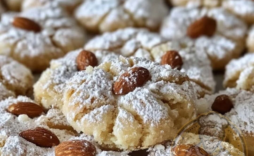4. Den Teig in kleine Portionen teilen und zu Kugeln formen. Die Kugeln in Puderzucker wälzen und auf jede Kugel eine Mandel legen. Auf das Backblech setzen.