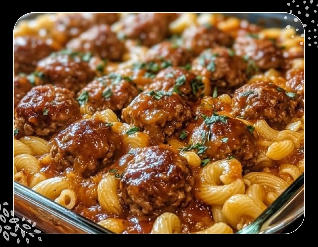 6- Auflauf vorbereiten: Die gekochten Nudeln mit der Tomatensauce in einer Auflaufform gut vermengen. Die Fleischbällchen gleichmäßig darauf verteilen und mit dem geriebenen Käse bestreuen.