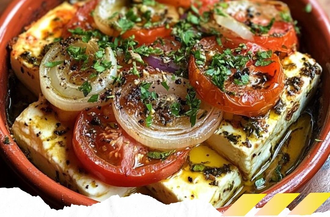 2. **Käse arrangieren:** Ein Stück Alufolie oder Backpapier auf die Arbeitsfläche legen. Den Schafskäse in die Mitte setzen. Tomatenscheiben und Zwiebelringe auf und um den Käse legen.
