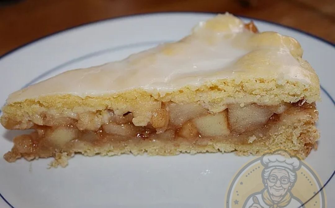 Das abgekühlte Apfelkompott auf dem vorgebackenen Boden verteilen. Den restlichen Teig ausrollen und als Decke darauflegen. Den Kuchen bei gleicher Temperatur weitere 15 Minuten backen. Danach den Kuchen herausnehmen und in der Form vollständig auskühlen lassen.
