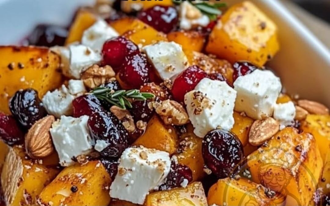 Gerösteter Kürbis mit Honig, Blaubeeren, Walnüssen und Feta-Käse