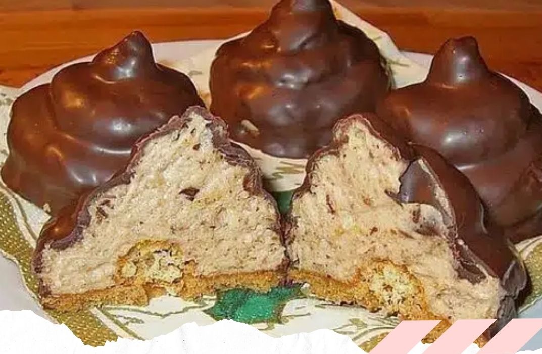 6- Marmelade glattrühren. Mürbeteigkreise mit Marmelade bestreichen. Jeweils 1–2 gehäufte EL Schoko-Biskuit-Creme daraufsetzen und mit Teelöffeln zu kleinen Bergen formen. Etwa 1 Stunde kaltstellen.