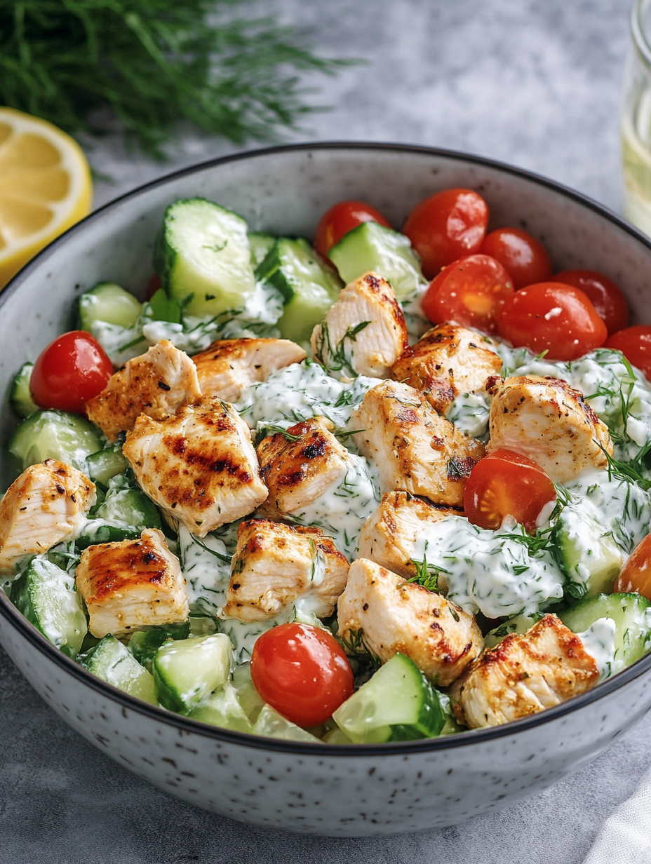 Der Griechische Hähnchen-Tzatziki-Salat ist eine moderne Interpretation klassischer griechischer Aromen. Saftiges Hähnchenfleisch trifft auf knackige Gurken, süße Kirschtomaten und cremiges Tzatziki. Stell dir vor, alle guten Dinge aus einer griechischen Taverne treffen sich in einer einzigen Schüssel – genau das ist dieser Salat.