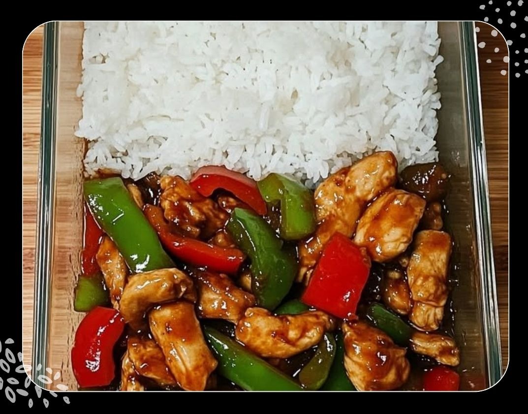 7- Die fertige Hähnchen-Paprika-Mischung zusammen mit dem Reis servieren oder in Meal-Prep-Boxen abfüllen.