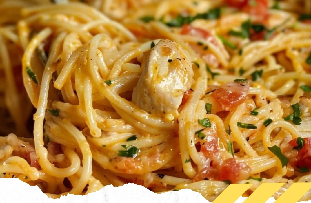 4- **Alles vermengen:** Die angebratenen Hähnchenstreifen und die gekochten Spaghetti in die Soße geben, gut vermengen und 2 Minuten ziehen lassen, damit die Aromen sich verbinden.