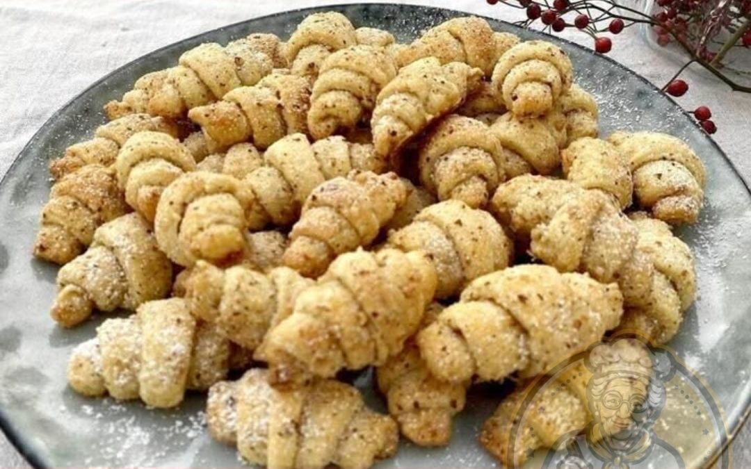 5. Den restlichen Teig auf die gleiche Weise verarbeiten. Die Teigstücke zu Croissants aufrollen, dabei an der breiten Seite beginnen und zur Spitze hin aufrollen.