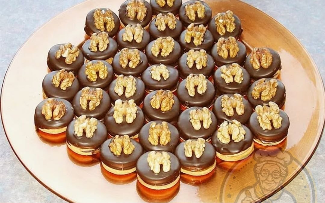 – Jedes Törtchen mit einer Walnusshälfte verzieren und die Glasur fest werden lassen.
