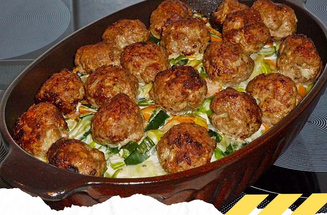 In eine mit Butter gefettete Auflaufform eine Schicht Kartoffelscheiben geben. Dann folgt eine Schicht Lauch-Karotten. Nach einer weiteren Schicht Kartoffeln wieder Gemüse. Nach jeder einzelnen Schicht die Käsesauce darüber gießen. Zum Schluss die Fleischbällchen oben drauf legen.