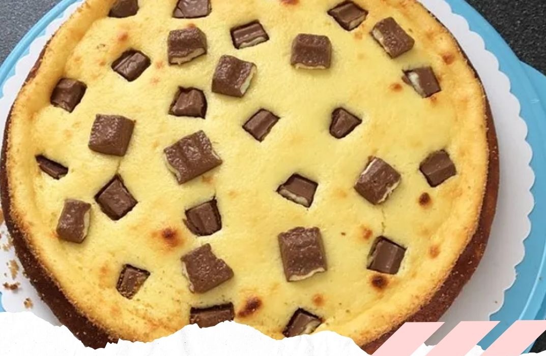 6- Die Quarkmasse auf den vorgebackenen Boden geben und die Kinderriegel in kleine Stücke schneiden, dann gleichmäßig auf der Masse verteilen.