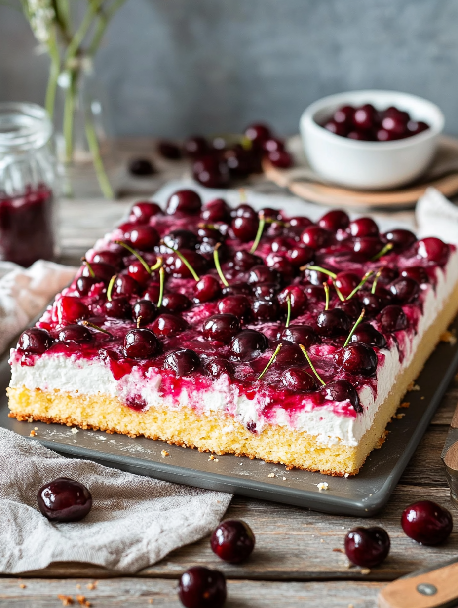 Stell dir vor: Ein fluffiger Boden, darauf eine cremige Schicht, fruchtige Kirschen und zum Schluss ein glänzender Kirschguss. Klingt verlockend, oder? Genau so schmeckt dieser Kuchen – wie ein kleines Dessert-Paradies direkt vom Backblech.