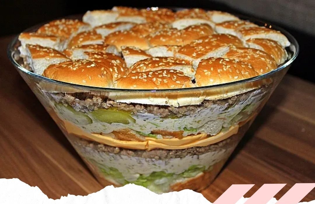 Für den Schichtsalat als Erstes 1/3 der Brötchenwürfel in eine große Glasschüssel geben. Anschließend folgt jeweils eine Hälfte des Eisbergsalates, der Sauce, des Fleisches. Dann eine Schicht Käsescheiben, der Rest der Brötchenwürfel (außer die für die letzte Schicht), der übrige Eisbergsalat, die zweite Hälfte der Sauce, eine Schicht aus Gewürzgurkenscheiben und die zweite Hälfte des Fleisches. Abschließend werden die gewürfelten Brötchendeckel auf den Salat gelegt, sodass die Sesamseiten nach oben zeigen.