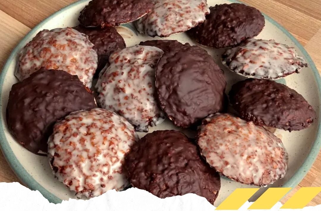 5. Nach dem Abkühlen die Lebkuchen mit geschmolzener Zartbitterschokolade überziehen und trocknen lassen.
