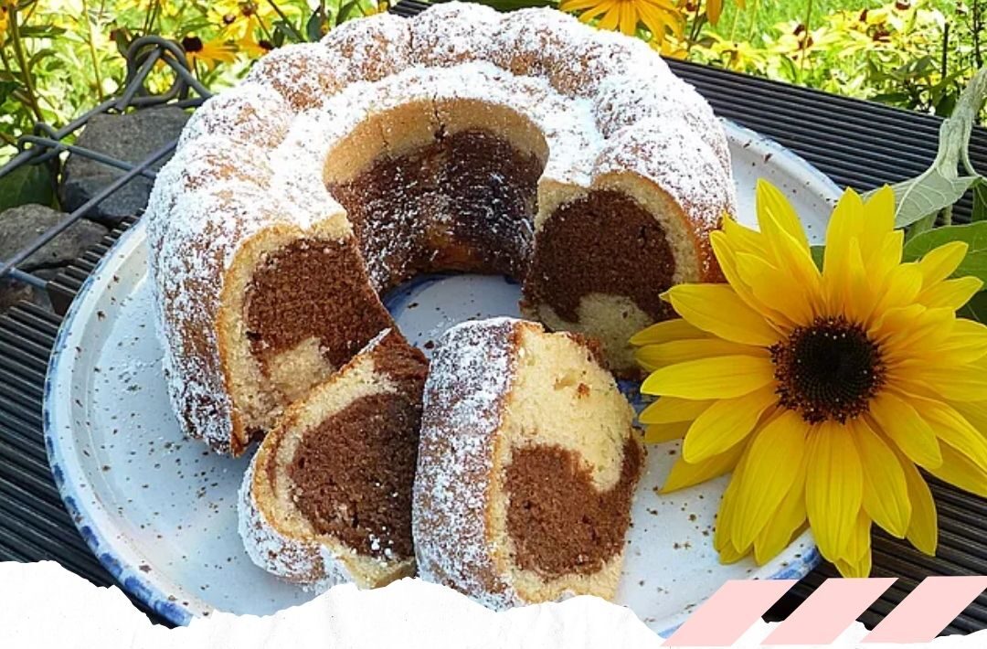 Eine Gugelhupfform (22–24 cm Durchmesser) einfetten und eventuell mit Mehl bestäuben. Die Hälfte des Teigs in die Form geben.