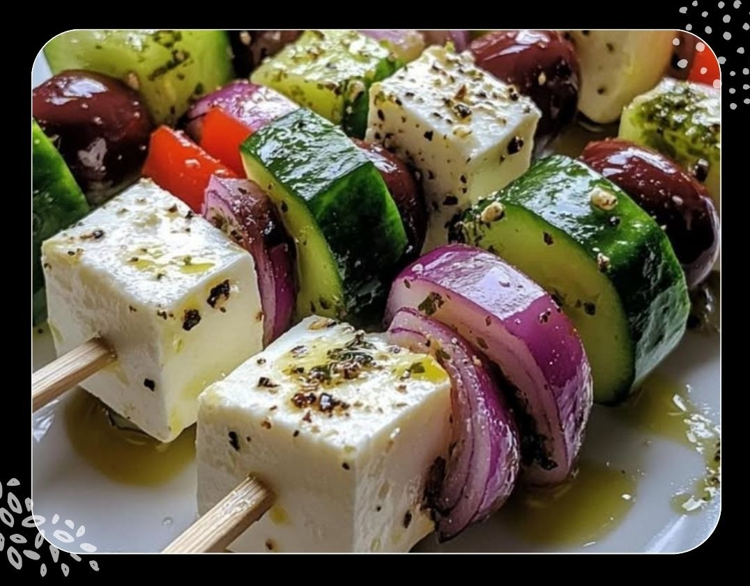 2- Einen Zahnstocher oder kleinen Spieß nehmen und abwechselnd ein Stück Feta, eine Gurkenscheibe, eine Olive und ein Stück Zwiebel aufspießen. Vorgang wiederholen, bis alle Zutaten aufgebraucht sind.