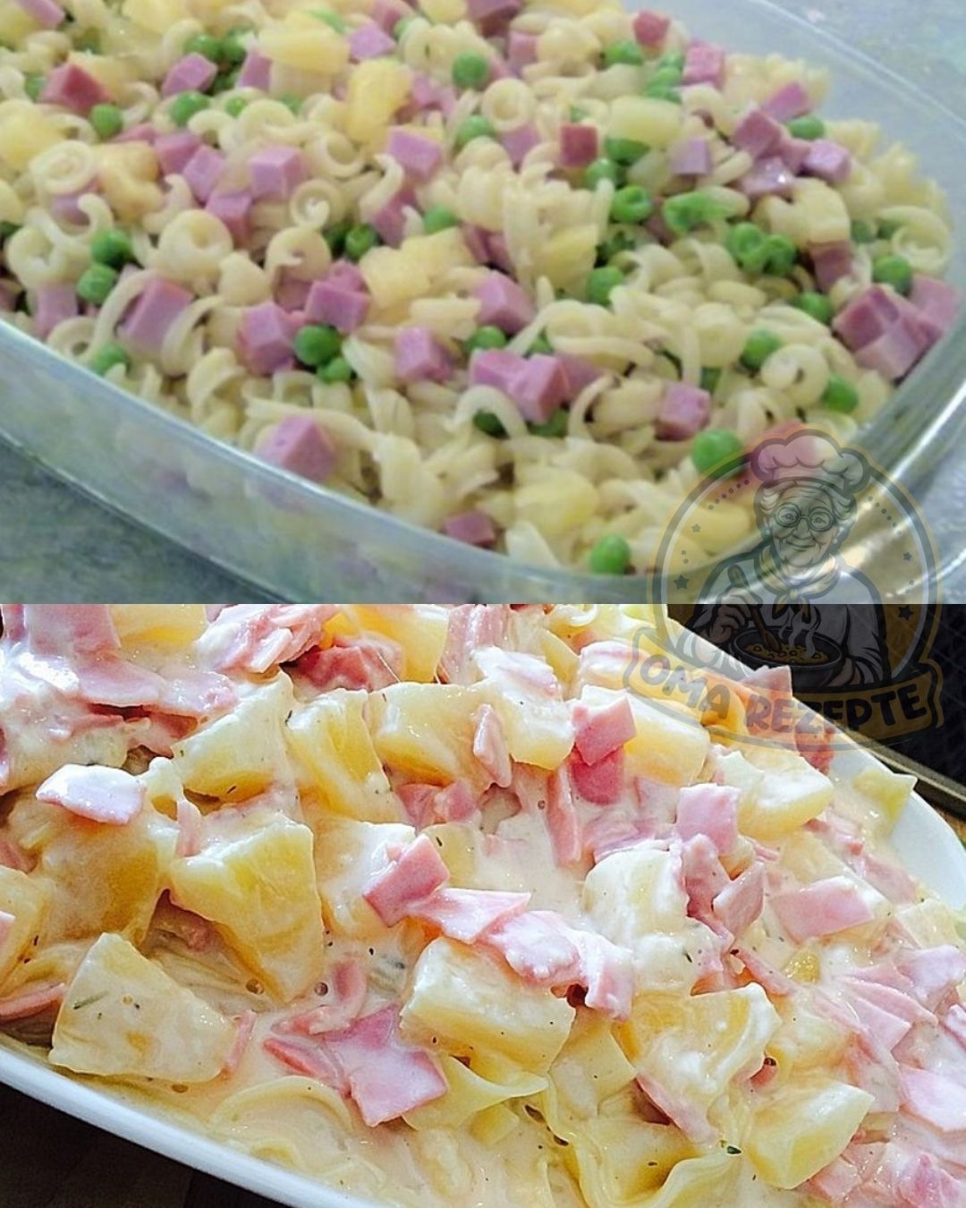 5- Die Hälfte der Nudeln in die vorbereitete Form geben. Ananasstücke und Schinkenwürfel darüber verteilen.