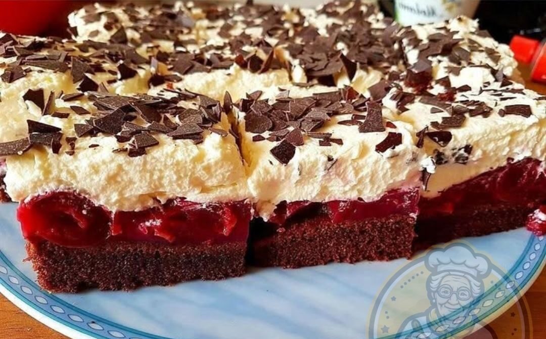 Alternative: Für eine Torte den Teig auf zwei Böden aufteilen, beide mit der Kirschmasse bestreichen. Etwas Sahne dazwischen geben und mit Sahne, Belegkirschen und Schokoblättern garnieren.
