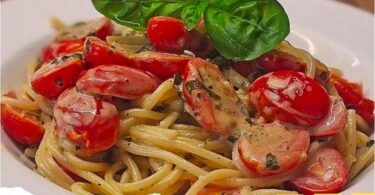 Nudeln mit marinierten Cherrytomaten und Frischkäse