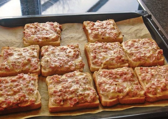 Danach die Masse auf das Toastbrot streichen und bei ca. 180°C im Backrohr 10-15 min. knusprig backen.