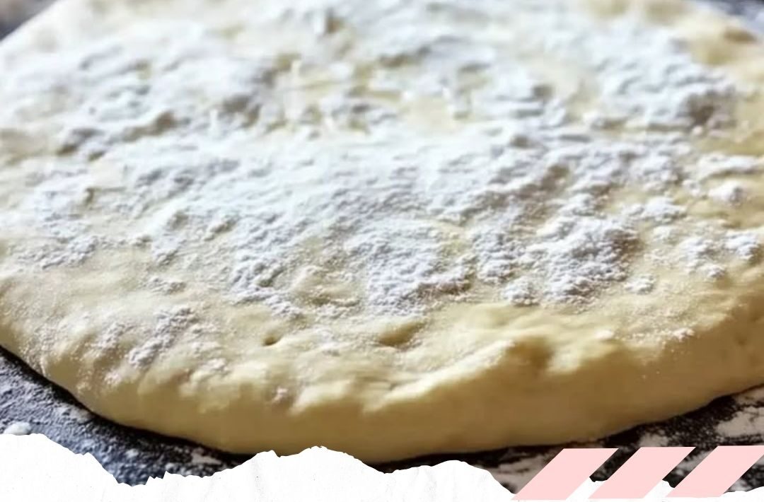 Den Teig herunterdrücken und in zwei Hälften teilen. Jede Hälfte auf einer bemehlten Fläche zu einem 30 cm Kreis ausrollen.
