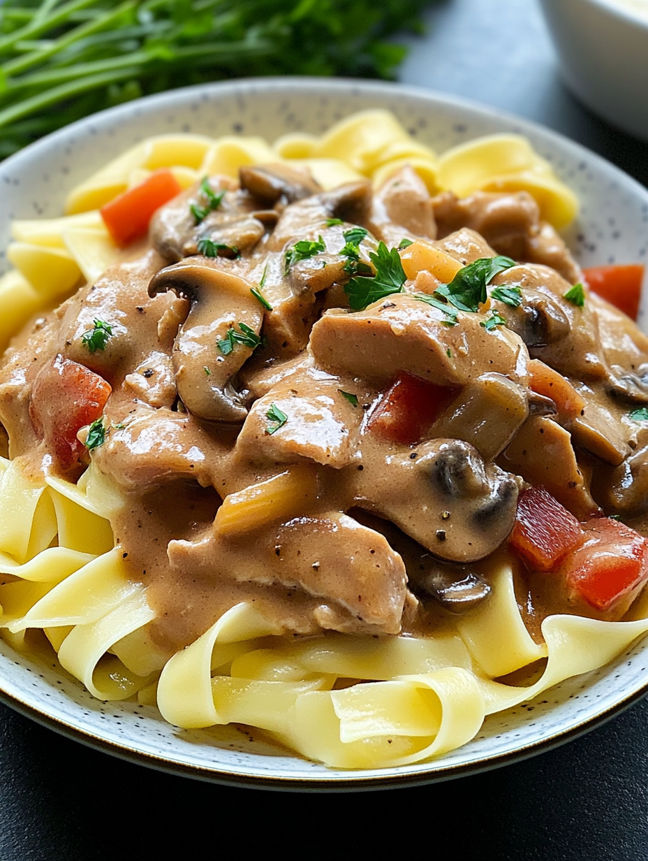 Puten-Sahne-Gulasch auf Bandnudeln ist kein lautes, exotisches Gericht. Es schreit nicht nach Aufmerksamkeit – es überzeugt leise. Durch Zartheit, Cremigkeit und diese runde, harmonische Kombination aus Fleisch, Pilzen und Sauce. Genau deshalb lieben es so viele.