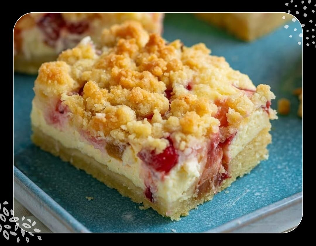 5- Quarkmasse auf dem Boden verteilen, Rhabarber darauf streuen.