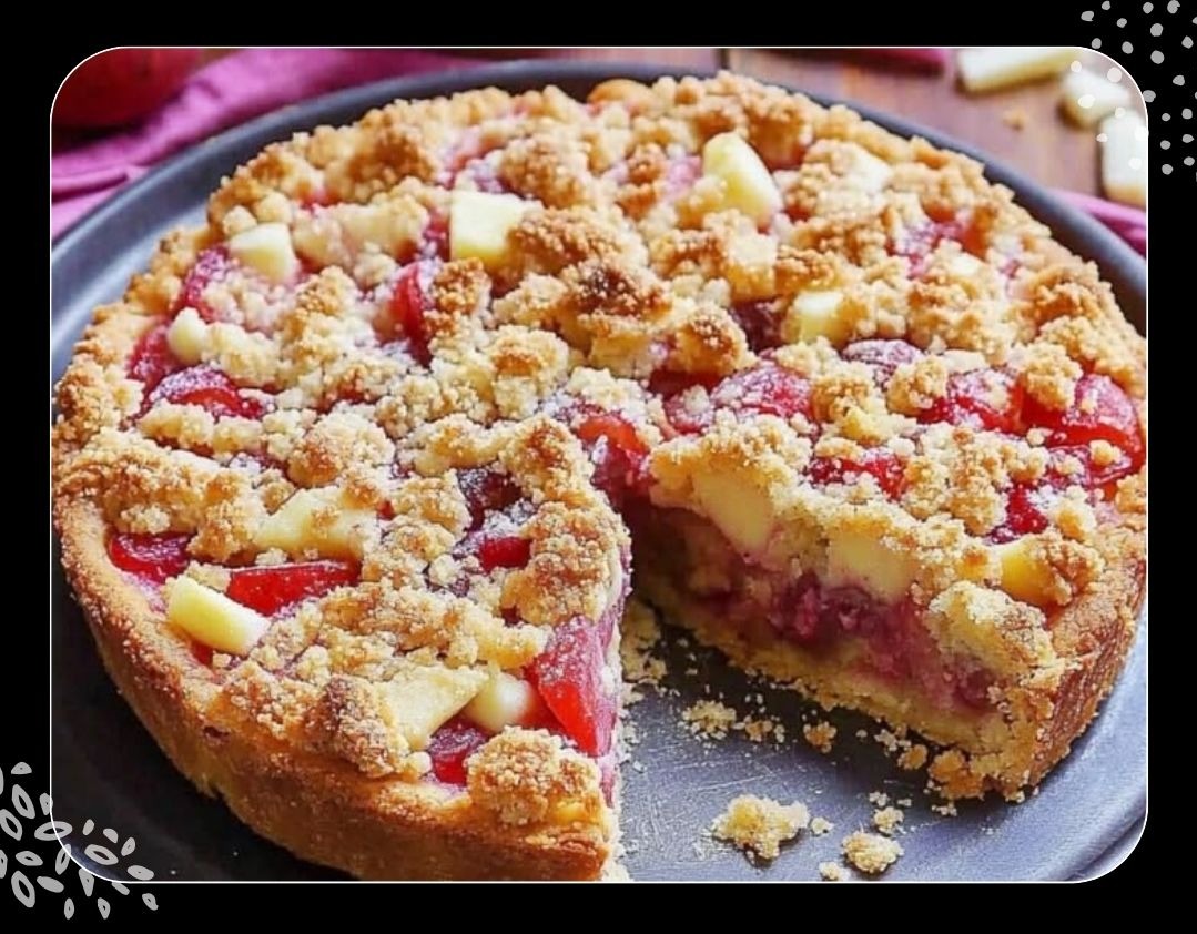 7- Verteile die restlichen Streusel als Topping über den Rhabarber.