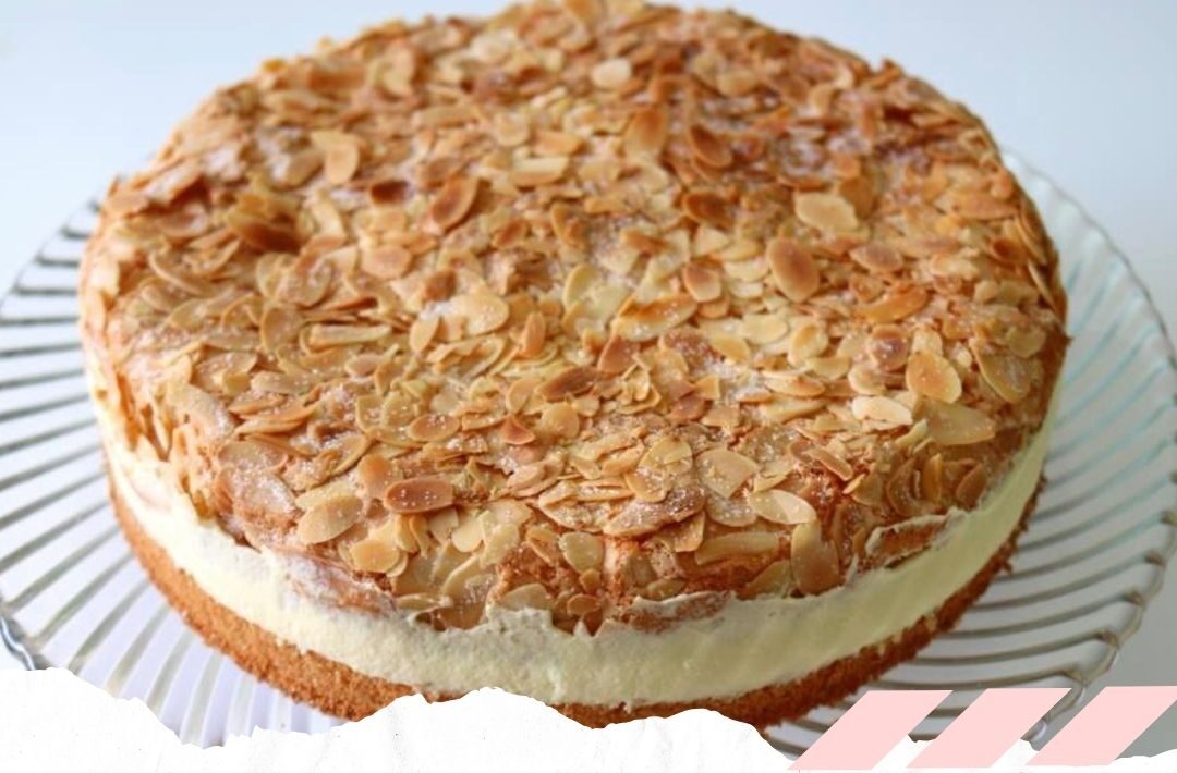 Den abgekühlten Kuchen waagerecht halbieren. Die untere Hälfte mit dem abgekühlten Pudding bestreichen, dann die obere Hälfte mit der Mandelkruste daraufsetzen.
