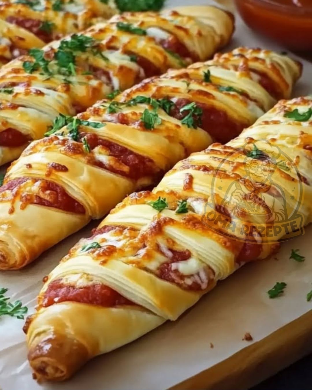 9- Die Pizzastangen auf das vorbereitete Blech legen.
