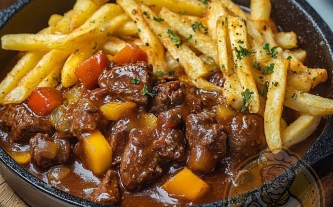 Das Fleisch in Würfel schneiden und in heißem Öl rundherum anbraten.