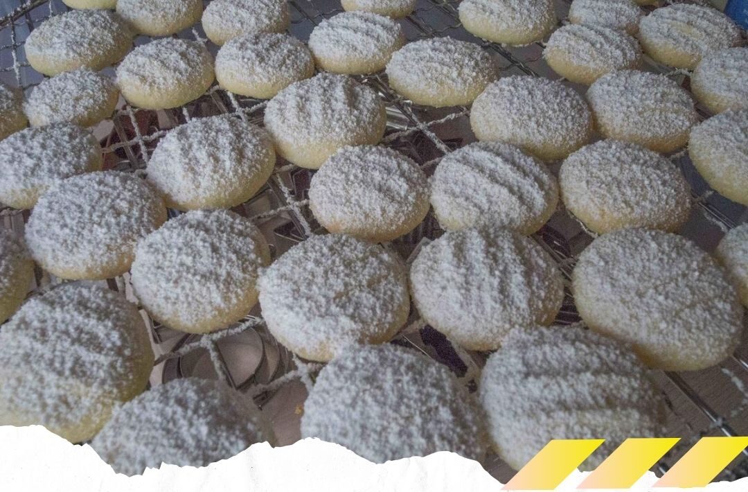 Alle Zutaten (außer dem Puderzucker zum Garnieren) mit einem Handrührgerät vermengen und zu einem geschmeidigen Teig verkneten. Aus dem Teig kleine Bällchen von etwa 2 cm Durchmesser formen. Mit einer Gabel tief in die Bällchen eindrücken, um ein Muster zu erzeugen.