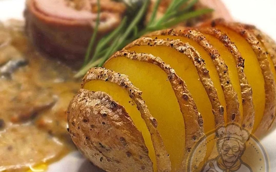 2- Kartoffeln gründlich waschen und bürsten. Anschließend quer in ca. 3 mm Abständen einschneiden, aber nicht ganz durchschneiden.