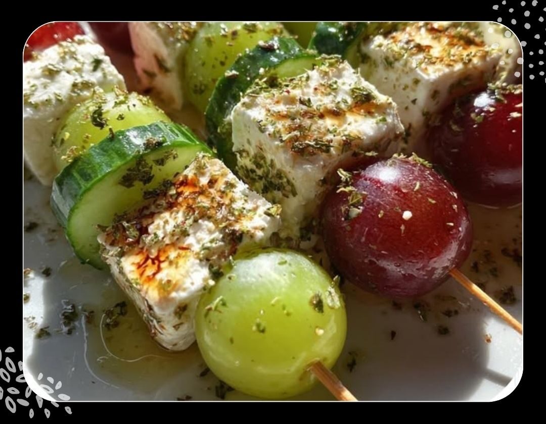 3- Einen Zahnstocher oder Spieß nehmen und abwechselnd Traube, Feta und Gurkenscheibe aufstecken. Wiederholen, bis alle Zutaten verbraucht sind.