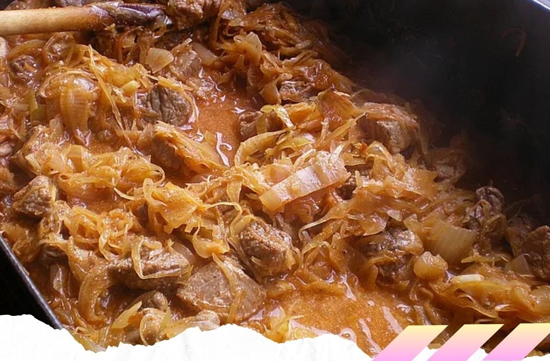 Den Speck in einem Topf auslassen, dann herausnehmen. Das Fleisch im Speckfett portionsweise anbraten, dann ebenfalls wieder herausnehmen. Zwiebeln und Knoblauch im Fett andünsten. Sauerkraut, Fleisch und Speck zufügen, mit Paprikapulver bestäuben, umrühren und knapp mit Brühe bedecken. Zugedeckt bei mittlerer Hitze ca. 1 Stunde schmoren, eventuell etwas Brühe nachgießen.