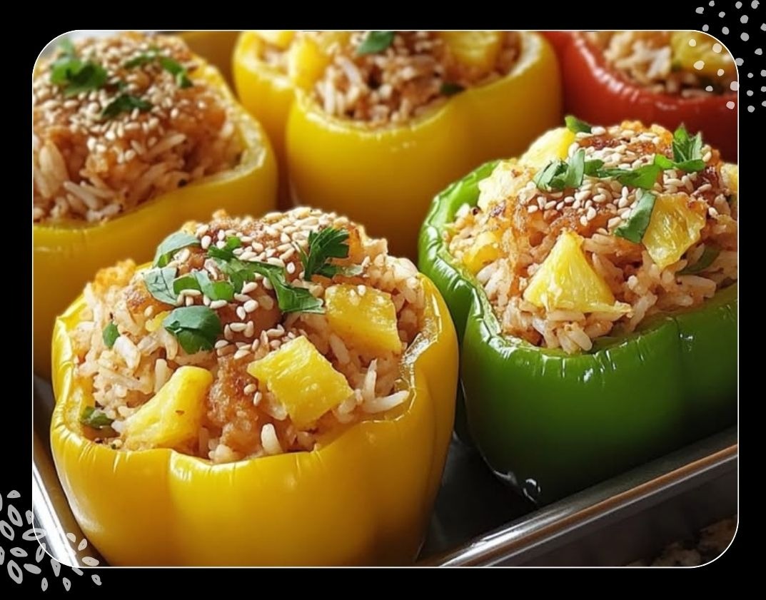 4- Paprikaschoten mit der Hähnchen-Reis-Mischung füllen. Auflaufform mit Alufolie abdecken und 25 Minuten backen. Folie entfernen und weitere 5 Minuten backen, bis die Paprika leicht goldbraun sind.