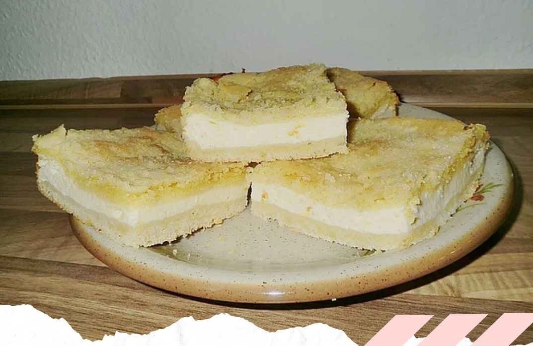 8- Eine Hälfte des Hefeteigs auf einem Blech ausrollen und die Quarkmasse darauf verteilen.