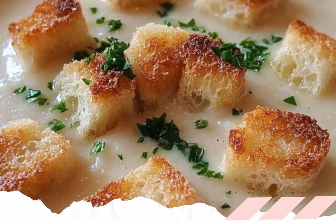 5. Die heiße Knoblauchsuppe in Schalen füllen, mit Croutons bestreuen und mit frischer Petersilie garnieren.