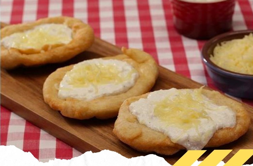 Die fertig gebackenen Langos nach Belieben mit der vorbereiteten Knoblauchcreme bestreichen und mit geriebenem Käse bestreuen.