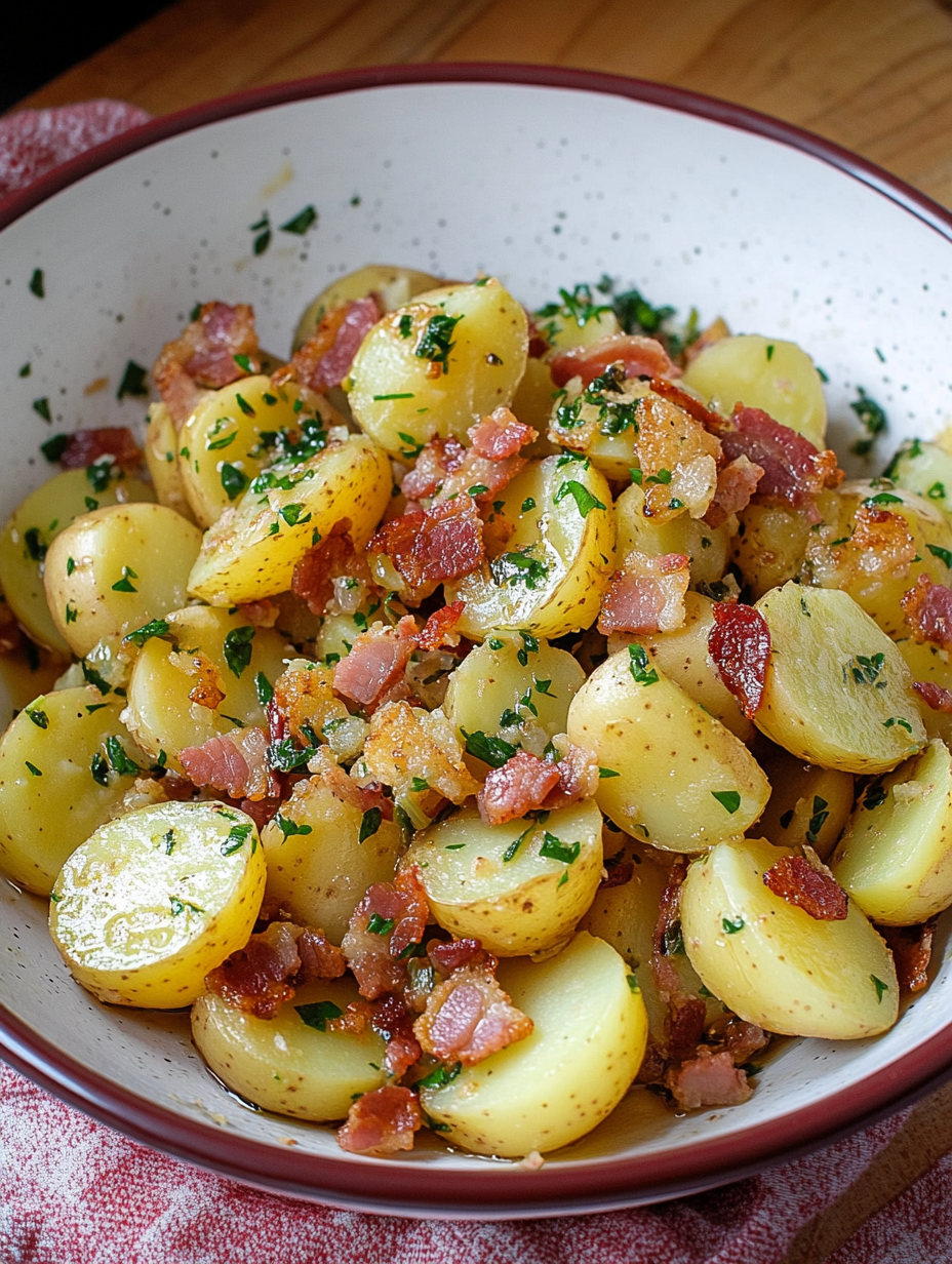 Servieren: Den Kartoffelsalat warm servieren und mit gehackter Petersilie bestreuen.