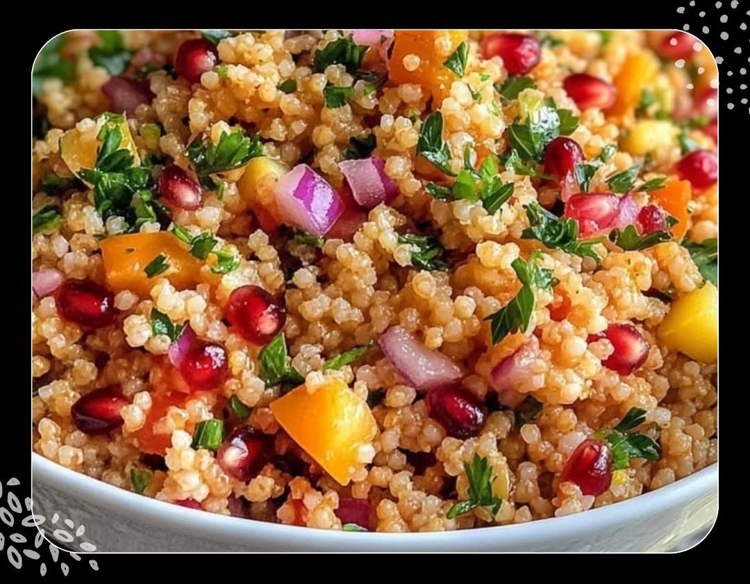 3- In einer großen Schüssel den abgekühlten Bulgur mit der gehackten Zwiebel, Paprika, Petersilie und Granatapfelkernen vermischen. Das Dressing darüber geben und alles gut vermengen.