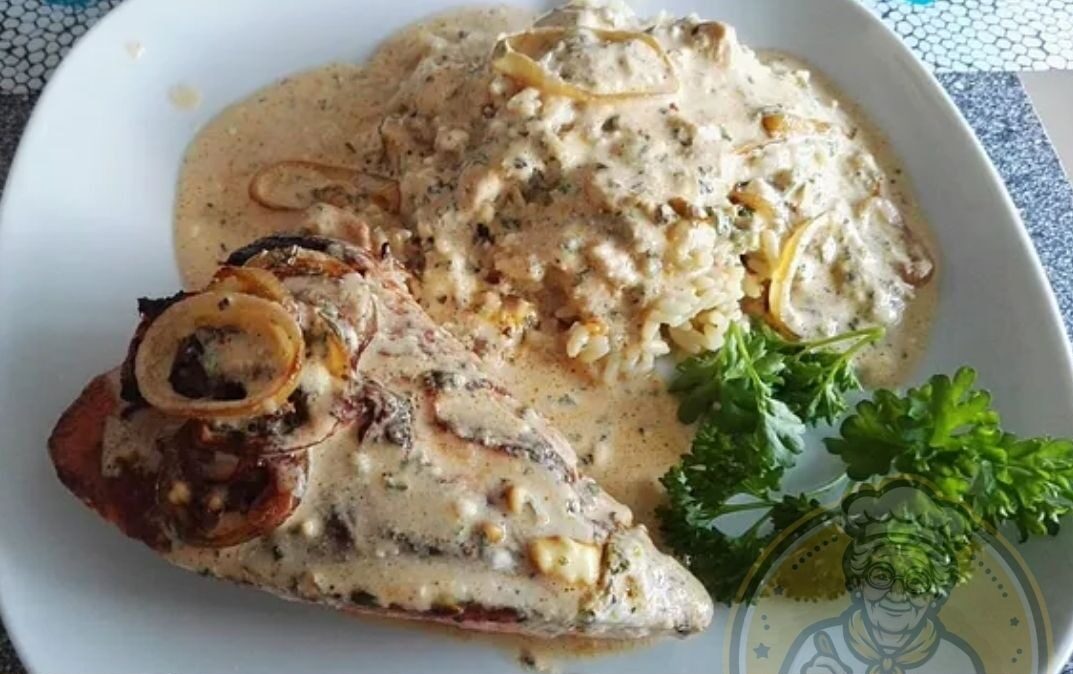 Die Zwiebeln halbieren und in feine Streifen schneiden. In der Pfanne goldbraun rösten. Die Sahne mit Crème fraîche und Weißwein verrühren, mit Knoblauchpulver würzen und zu den Zwiebeln geben. Etwa 5 min köcheln lassen, bis die Sauce etwas reduziert ist. Über die Schnitzel geben und den Käse darüber streuen.